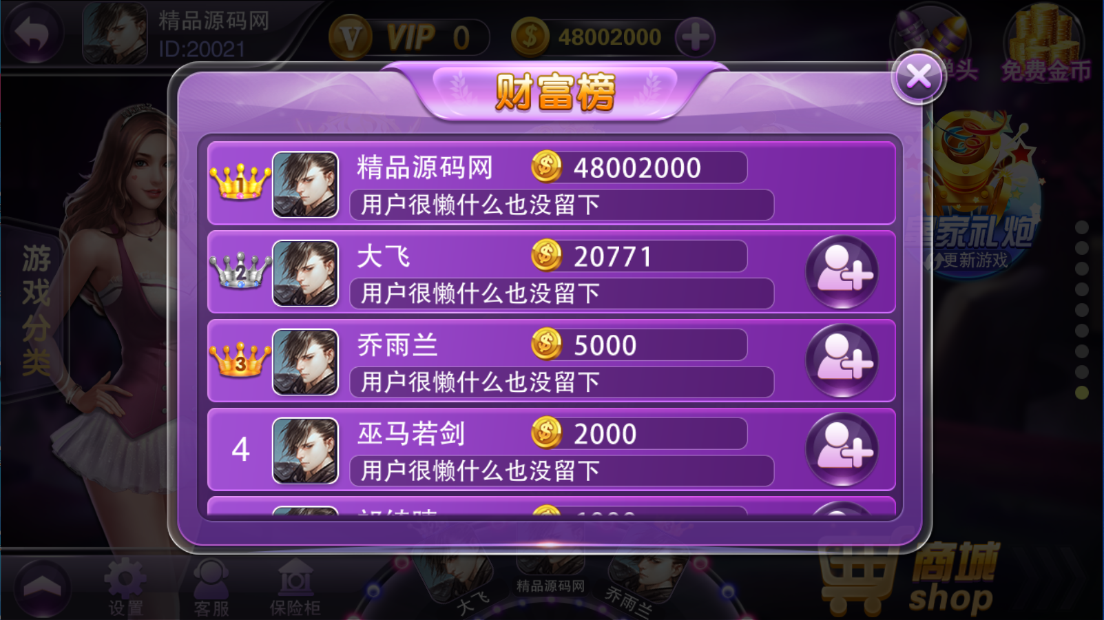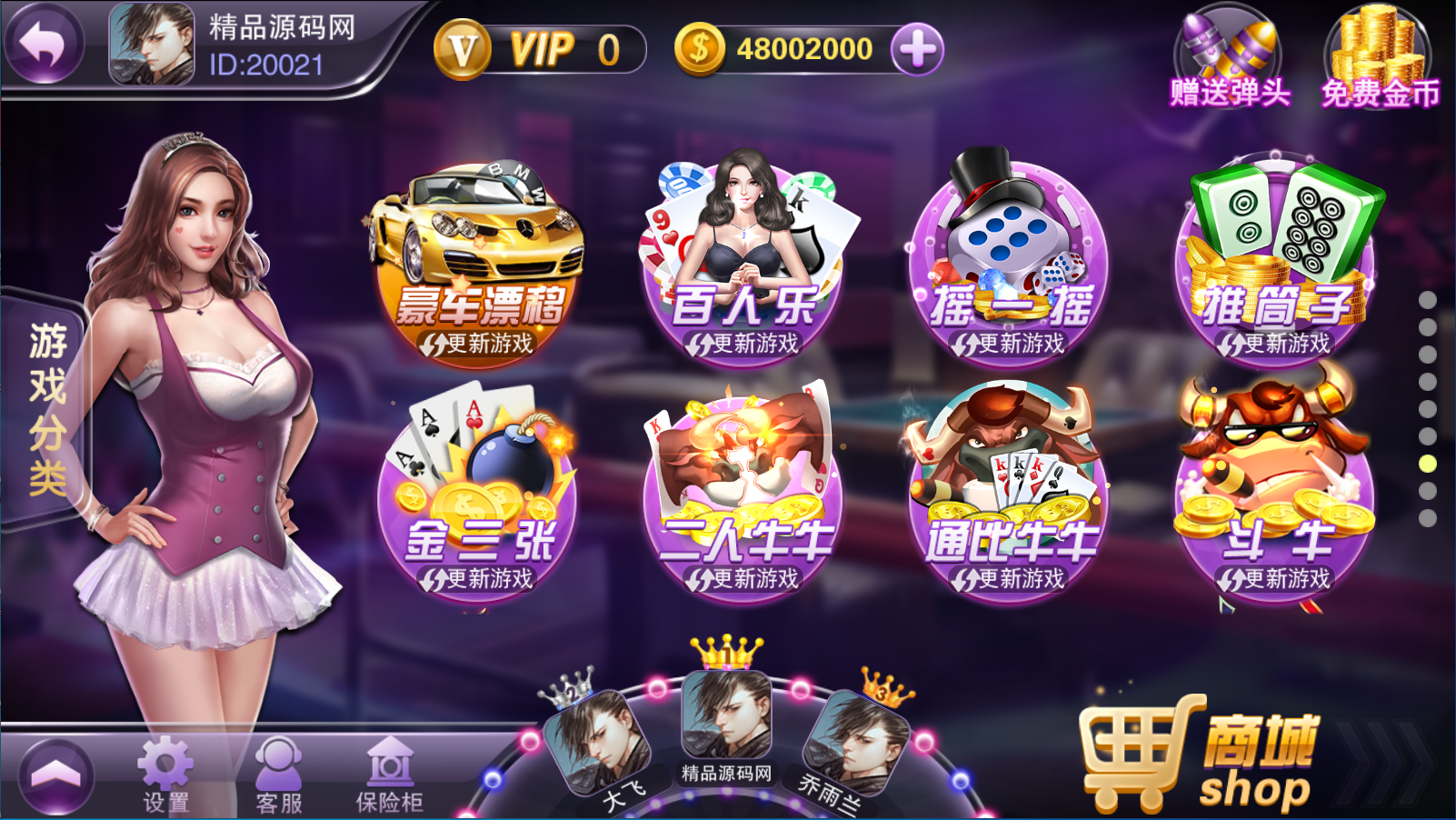 源码介绍: 游戏相当不错,站长亲自测试了下 功能都正常没啥问题 精美前端界面,子游戏众多,包括了拉霸类游戏,百人类游戏,捕鱼类游戏和棋牌类游戏,有智能陪玩机器人,代理系统,精准ID点控 亲测时顺便清除了程序中的后门文件和木马,并且录制了详细的搭建教程 整合修复优化了这套全新富贵3镜像,一键开通实例搭建部署,服务器环境什么的都搞好了,搭建起来非常方便 就算是刚入门的小白使用本站配套程序跟着本站教程,亦能成功搭建 平台共计43款子游戏: 拉霸类游戏:疯狂的7、武财神、疯狂的猴子、疯狂麻将、火焰连击、多财多福、财神赐福、上海百家门、五龙争霸、三只猴子、金龙献宝、黄金龙王、恭喜发财、金鸡报喜、水浒传 百人类游戏:红黑大战,龙虎斗,宝马游戏、六狮王朝、飞禽走兽、五星宏辉、金鲨银鲨、水果机、森林舞会、关公战秦琼、百人牛牛、百人乐、豪车漂移、摇一摇、推简子 捕鱼类游戏:神龙宝藏、摇钱树、李逵劈鱼、皇家礼炮、金蟾捕鱼、淡水鱼、海王2 扑克类游戏:跑得快,十三水,斗地主,智勇三张、二人牛牛、通比牛牛、斗牛 |